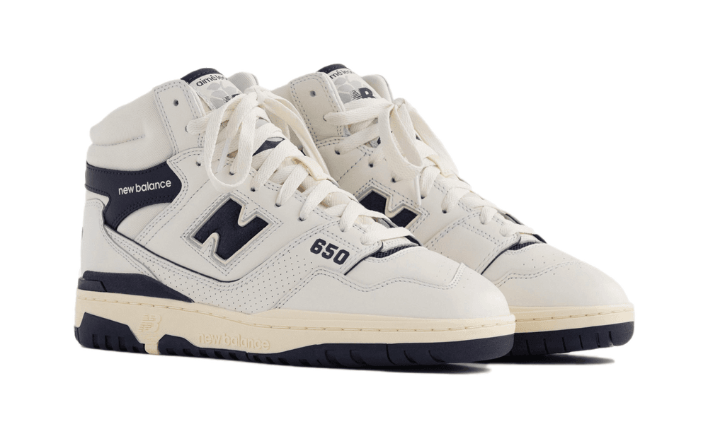 La colorazione White Navy vede una tomaia in pelle bianca con rinforzi in pelle bianca e navy. La suola si divide in una midsole bianco panna ed una outsole navy. L’iconica N viene proposta in pelle scamosciata navy, mentre lacci e linguetta si colorano di bianco. La scarpa si completa con il branding dato dalla scritta 650 ricamata sulla tomaia, scritta New Balance sul rinforzo della caviglia, logo Aime Leon Dore sulla linguetta e sul tallone sinistro, e logo NB sul tallone destro.