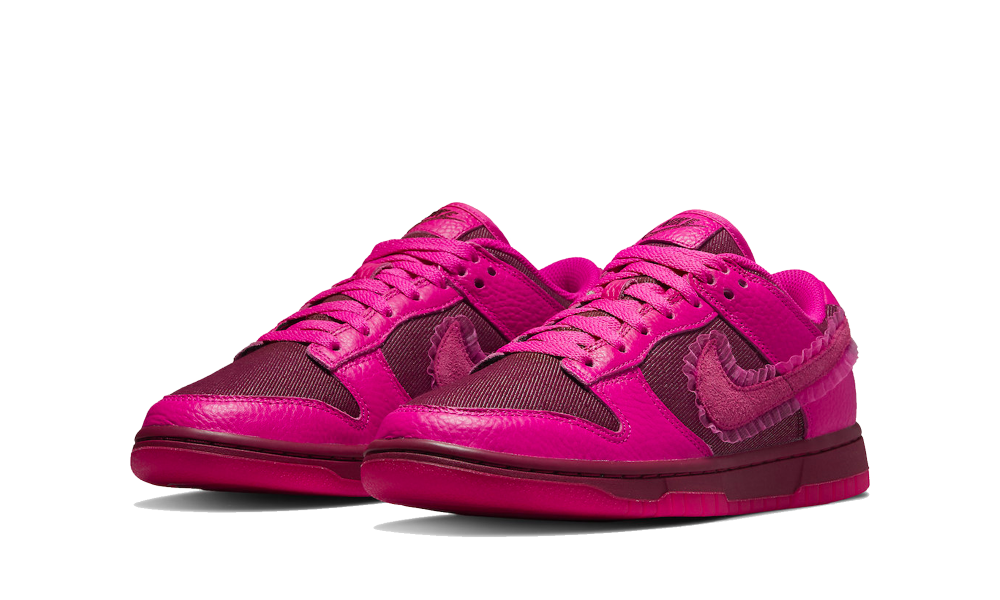 Le Dunk Low Valentine's Day 2022 vedono in questa versione più eccentrica una tomaia in canvas bordeaux e dei rinforzi in pelle fucsia. Lo stesso contrasto viene trovato nella suola con una midsole bordeaux ed una outsole fucsia. Lo Swoosh in pelle scamosciata rosa scuro propone un dettaglio rosa lungo il suo intero perimetro, aggiungendo particolarità alla silhouette. Linguetta fucsia e bordeaux e lacci fucsia completano la scarpa insieme al branding dato dal logo Nike sulla linguetta e la scritta Nike ricamata sul tallone.