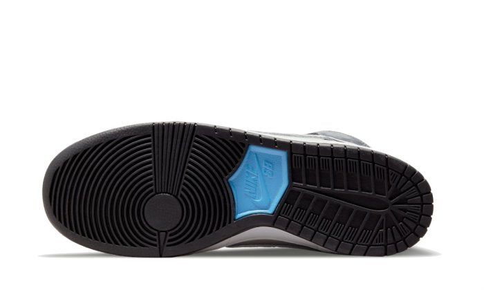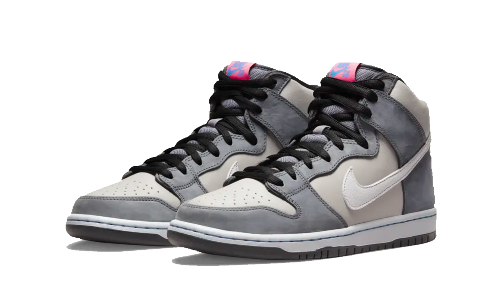 La sneaker offre una tomaia in pelle grigio chiaro con rinforzi in nubuck grigio scuro. La suola vede una midsole bianca con dettaglio blu e una outsole nera. Linguetta blu e nera accompagna dei lacci neri, mentre il tag rosa sulla linguetta mostra il logo Nike SB.