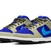 La sneaker vede una tomaia in pelle scamosciata blu con rinforzi in pelle scamosciata verde neutro. La suola bianca e nera lascia spazio ad uno Swoosh azzurro in pelle scamosciata. Lacci verdi scuro accompagnano una linguetta blu, mentre il logo Nike SB sulla linguetta e la scritta Nike sul tallone completano la scarpa.