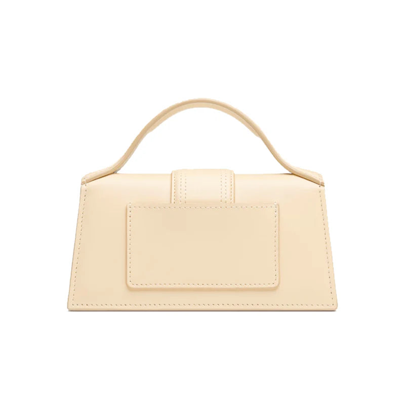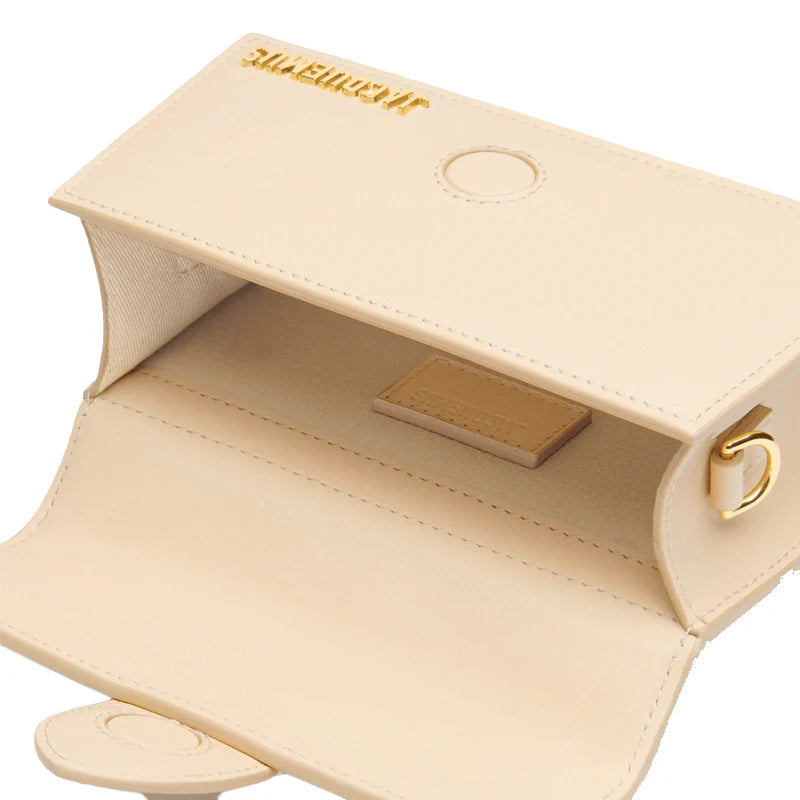 Il colore avorio, luminoso e sofisticato, conferisce alla borsa un'allure eterea che si abbina perfettamente sia a look monocromatici che a outfit più colorati. La versatilità è garantita dalla tracolla regolabile e dal manico superiore elegantemente curvato, che permettono di indossarla a tracolla o portarla a mano secondo l'occasione. La chiusura magnetica con patta assicura praticità d'uso, mentre la tasca posteriore per carte offre uno spazio discreto per gli essenziali. Il logo Jacquemus in metallo dorato sulla parte frontale aggiunge un tocco di lusso contemporaneo che risalta magnificamente sul fondo ivory.