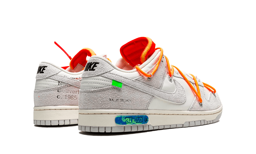 Swoosh in pelle scamosciata grigio chiaro con dettaglio verde accompagna dei lacci bianchi e dei lacci arancioni in stile outdoor, icona delle rivisitazioni Off-White delle Dunk Low.
