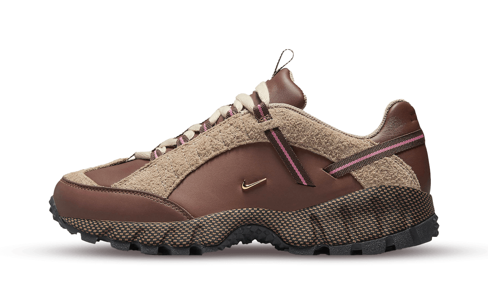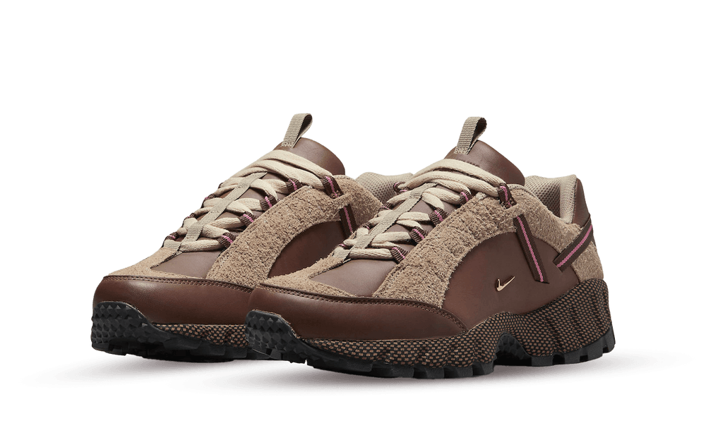 La colorazione Brown offre una tomaia in pelle marrone con rinforzi in pelle marrone e pelle scamosciata beige. La suola chunky vede una midsole a scacchi beige e nera ed una outsole nera. Gli occhielli marroni e fucsia catturano l’attenzione ed accompagnano una linguetta marrone e dei lacci beige con le estremità in pelle con uno Swoosh al centro. Un pull tab sulla linguetta completa la silhouette insieme al branding dato dalla scritta Jacquemus sulla linguetta e sul tallone, e dallo Swoosh orato sui lati della tomaia.