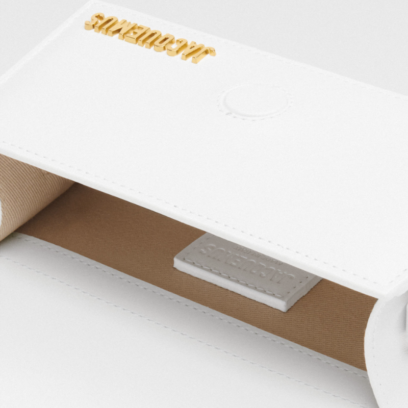 La sofisticata chiusura magnetica con linguetta assicura praticità quotidiana, mentre la tasca applicata posteriore aggiunge funzionalità discreta. Il logo Jacquemus e le rifiniture in metallo argentato creano un contrasto raffinato sulla superficie candida.
