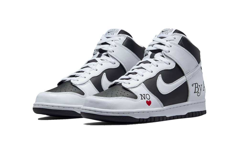 La colorazione Black White offre una tomaia in pelle nera con rinforzi in pelle bianca. La suola si divide in una midsole bianca ed una outsole nera. Lo Swoosh in pelle bianca accompagna una linguetta nera e dei lacci bianca. La sneaker si distingue per i dettagli lungo la silhouette con la scritta By Any Means ricamata sul lato posteriore della scarpa e con la scritta NO ricamata sul rinforzo della tomaia insieme ad un cuore. Il branding completa questa scarpa da collezione con la scritta Supreme Team ricamata sulla zona posteriore della caviglia e con il tag sulla linguetta che presenta la scritta SUP con sopra lo Swoosh.