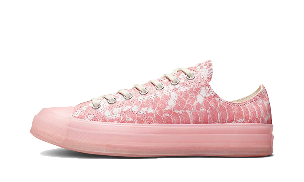 Le Converse Golf Wang Chuck Taylor 1970 OX Snake Pink Vintage White offrono una tomaia rosa con pattern a pelle di serpente bianco. La suola si colora totalmente di rosa leggermente traslucida e accompagna il rinforzo del toebox che viene colorato sempre di rosa. Linguetta dello stesso pattern della tomaia, lacci bianco panna e occhielli in metallo completano infine la sneaker insieme all’iconico tag Chuck Taylor sul tallone.