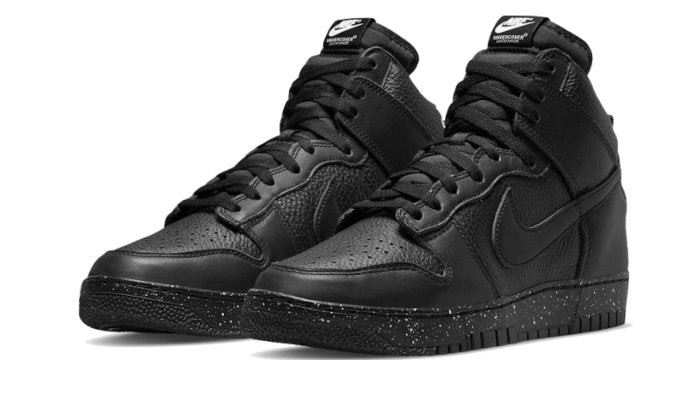 La Dunk High Undercover Black Paint Splatter offre una tomaia in morbida pelle nera con rinforzi in pelle nera. La suola vede una midsole nera con pattern bianco ed una outsole nera. Lo Swoosh in pelle nera mantiene il look monocromatico della silhouette insieme alla linguetta e lacci neri. La scarpa si completa con le scritte in tedesco NEUES LEBEN ricamata dietro alla caviglia sinistra e la scritta CHAOS sul tallone sinistro, insieme alla scritta NEUES LÄRM ricamata dietro alla caviglia destra e la scritta GLEICHGEWICHT (equilibrio) sul tallone destro. Il branding Nike e Undercover è invece dato dal tag sulla linguetta.