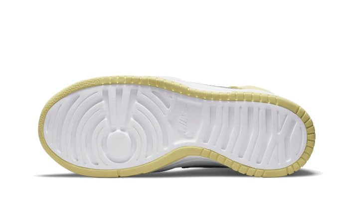 La sneaker propone una tomaia in pelle bianca con rinforzi in pelle gialla. La suola chunky vede una midsole bianca ed una outsole gialla, mentre gli Swoosh si colorano di giallo e grigio. Al look eccentrico di questa Dunk vengono aggiunti un pulltab grigio e l’imbottitura interna della caviglia lime. Linguetta bianca e lacci gialli completano la scarpa insieme al branding dato dal logo Nike sulla linguetta.