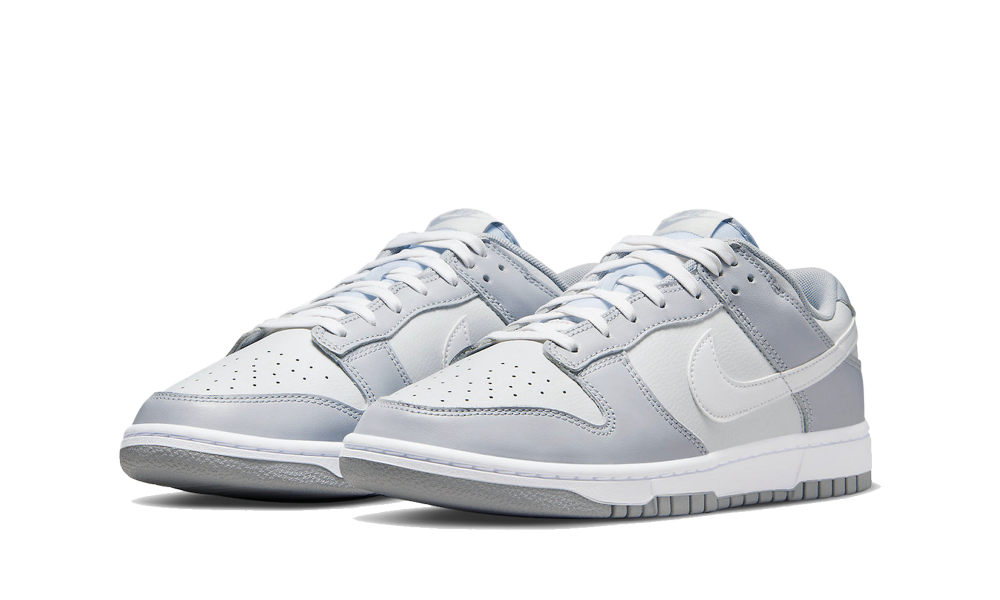 La versatilità dei colori Two Tone Grey incontra la silhouette delle Dunk Low. La sneaker vede una tomaia in pelle grigio chiaro con rinforzi in pelle grigia. La suola offre una midsole bianca ed una outsole grigia, mentre lo Swoosh viene proposto in pelle bianca. Linguetta grigio chiaro e lacci bianchi completano la scarpa insieme al branding dato dal logo Nike sulla linguetta e la scritta Nike ricamata sul tallone.