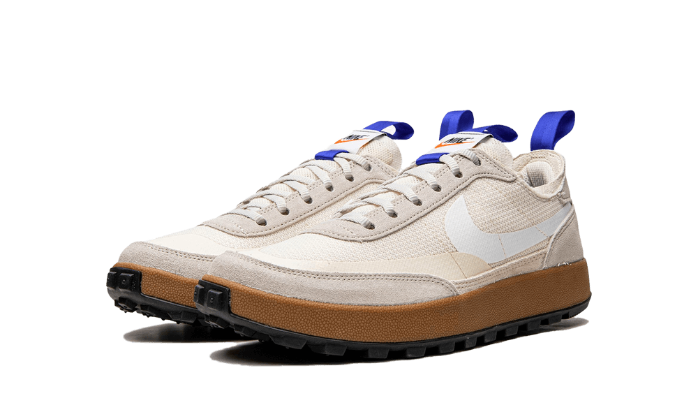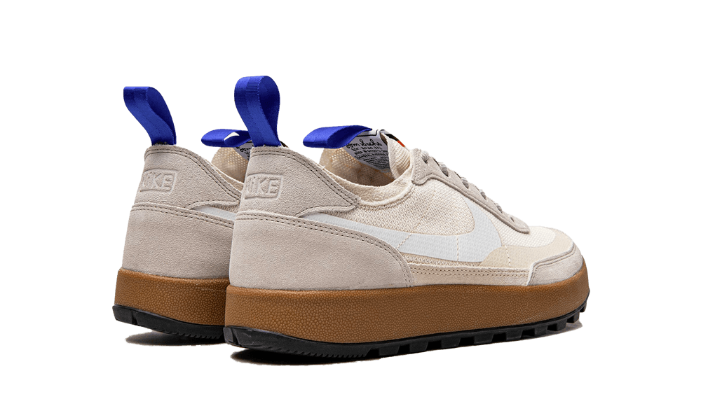 Volutamente giudicata come “Boring” nelle pubblicità della scarpa, la Nike Craft General Purpose Shoe Tom Sachs vede una tomaia bianco panna con rinforzi in pelle scamosciata grigio chiaro. La suola si inverte con una gumsole usata per le midsole ed una outsole nera con un profilo che ricorda le Waffle. Linguetta bianca e lacci grigio chiaro accompagnano uno Swoosh bianco panna. La nota di colore viene data dai pull tab blu, uno dei quali passa attraverso il tag sulla linguetta. Il branding completa infine la scarpa con il tag Nike sulla linguetta e la scritta Nike impressa sul tallone.